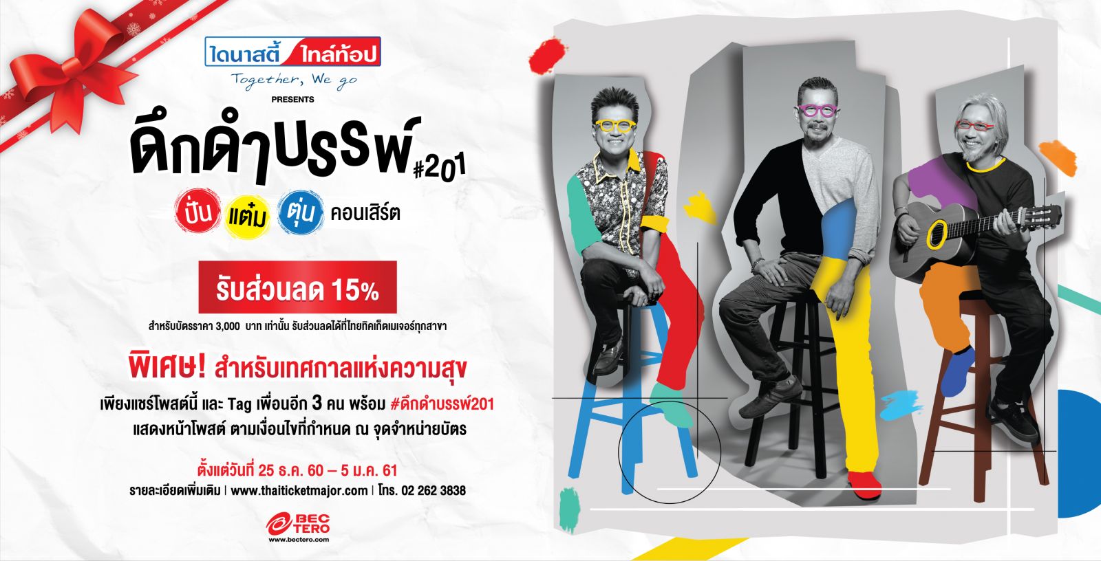 โดยคอนเสิร์ตหนนี้ซึ่งใช้ชื่อว่า “ไดนาสตี้ ไทล์ท้อป พรีเซ้นท์ ดึกดำบรรพ์ #201 ปั่น แต๋ม ตุ่น คอนเสิร์ต” จะจัดขึ้นในวันเสาร์ที่ 24 กุมภาพันธ์ 2561 ที่ เอ็กซิบิชั่น ฮอลล์ 4 อิมแพ็ค เมืองทองธานี (ซื้อบัตรได้ที่ http://www.thaiticketmajor.com/concert/duk-drum-ban-201-2018-th.html)